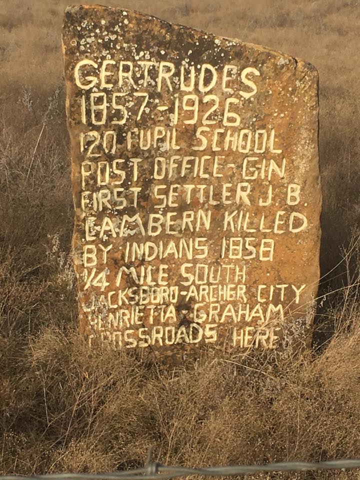 1857 James and Margery Cambern filed on two surveys about 15 miles Northwest of Jacksboro. On 12 Jan 1858, Margery wrote a letter to her brother's family back in Tyler describing their surroundings as very promising, that they had already harvested a crop of wheat, and that "we have good land, good range, timber enough and good water." She goes on to say that she had seen only three white men since last August, and finally, to direct their letters to her family to Weatherford. Though the letter had been written in January, there had been no chance to mail it. (This letter was found in their home by relatives, after most of her family had been murdered by white men and Indians on 18 Apr 1858.)