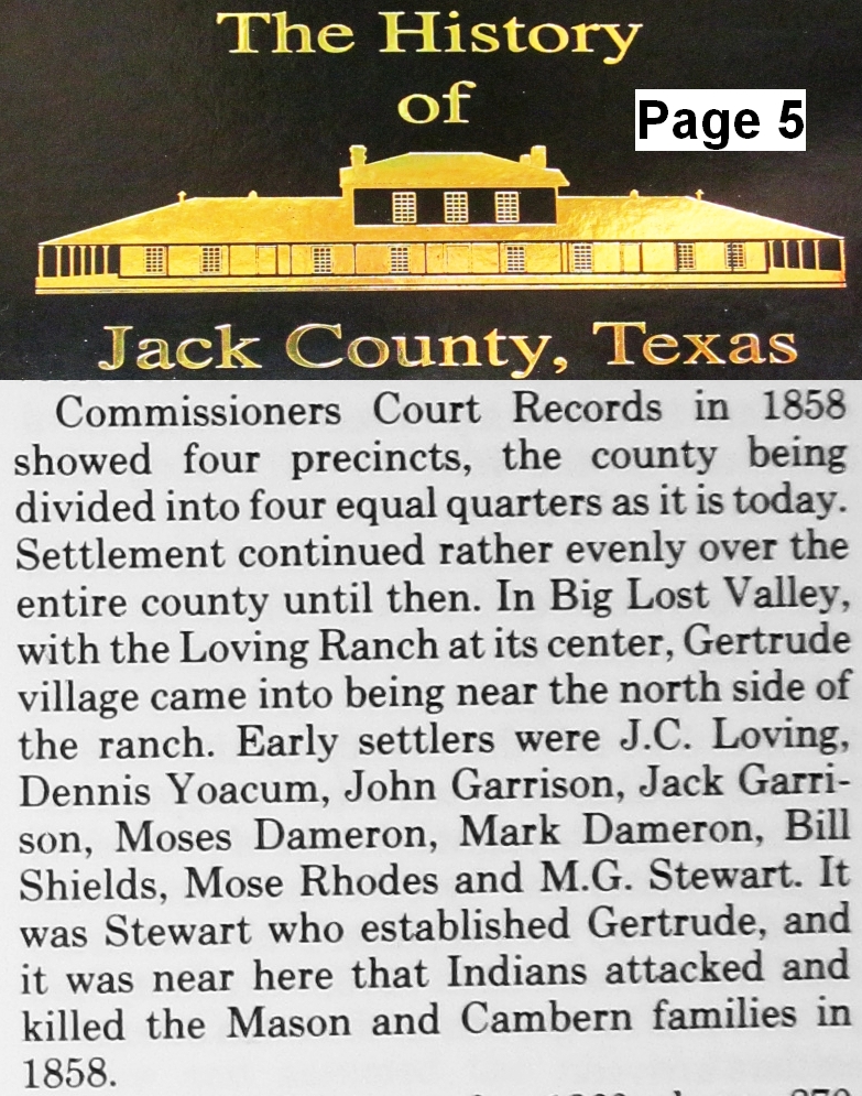 April 18, 1858; Jermyn, Texas: In April 1858, about a year after Jack County, Texas, was organized, a band of Indians, joined by several white bandits, raided a settlement in the northwest section of the county, murdering several residents, The community, located a few miles north of present-day Jermyn, on the north end of Lost Valley, was then known as Gertrude. The creek flowing through the valley is now called Cameron Creek -- also spelled Camberon, Cambren, and Cambern -- after the Cambren family, the victims of the most vicious of the attacks.