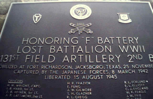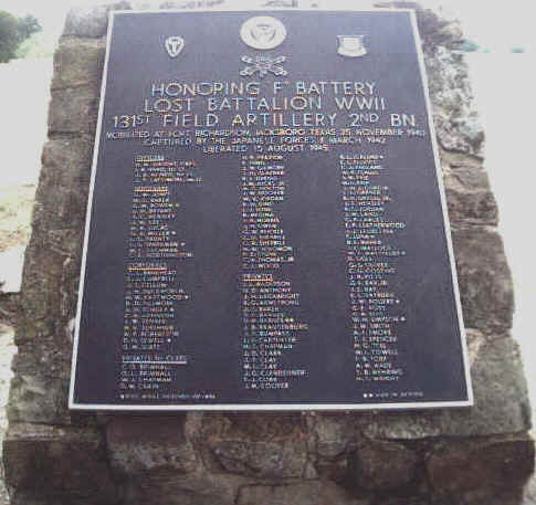 Officers H W Wright, Capt. I B Hard, 1st Lt. J B Heinen, 1st Lt. J P Lattimore, 2nd Lt. Sergeants G W Jones M L Baker G M Bowen * J H Bryant J C Hensley J W Lee H A Lucas G R Miller * L G Prunty L S Sparkman * M E Tilghman C E Worthington Corporals C L Bankhead C J Campbell J T Cellum J H Duckworth H W Eastwood * B D Fillmore J D Forgey * C R Johnson J W Kenner H V Kershner W P Robertson D H Sewell * G W Slate Privates 1st Class C O Brimhall O L Brimhall W J Chapman D W Crain H R Frazior E Fung J W Gilmore T H Glazner R L Gregg J M Hicks, Jr M G Holton J W Hoover W V Jordan R W King L J Long R Medina J R Morris J H Owen G W Reickle C N Sherrill C R Sherrill H W Solomon P E Stone C A Thomas, Jr C L Wood Privates L L Anderson N D Anthony J H Argabright R G Armstrong J T Baker D F Barnes D H Barnes ** J B Brandenburg J F Bumpass L J Carpenter H E Chapman J D Clark J F Clay M L Clay J G Clendenen R J Cobb J M Cooper R L Ecklund * E L Elliott C J England W K Feagle J W Frie M L Frie J de J Garcia E L Garner R N Gregg, Jr J E Hensley R E Jordan J M Laird G P Lawley E P Leatherwood J J Ledbetter E Luna * B E Maher S C Matlock W F Mattfeldt * R Ogle G S Oliver C G Oosting J B Pitts G F Ray, Jr J E Ray E L Rayburn J W Rogers * G E Ross G B Self W H Simpson J W Smith A F Smoke T J Spencer H G Teel W L Tidwell F B Torp A W Wade T B Wehring H T Wright * Died While Prisoner of War ** Died in Action |