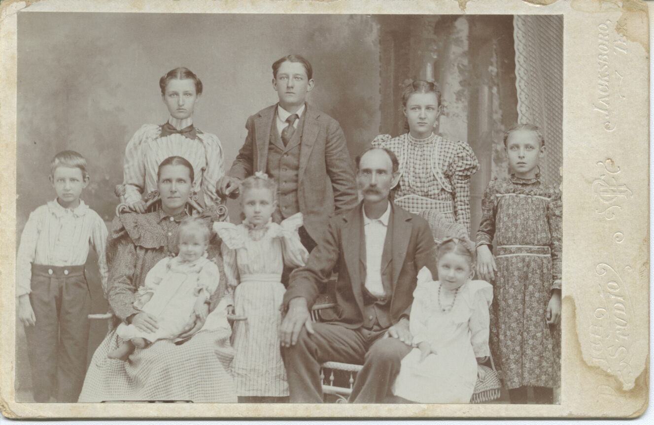 According to the inscription this picture was taken at the Price Studio in Jacksboro. The photograph is of my great grandfather Joseph Macajah Whitsett and his family. Joseph was called Cage or Cager due to his middle name. I believe the photograph was taken around 1898 based on the children who are in the picture and those who are not. I have only this copy. The original I believe is in the possession of a distant cousin in Tennessee. My information is that the family came from Giles County Tennessee to Jack County in the 1880s settling in the Roberts Branch area where some of Joseph’s family had settled some years earlier. Joseph left Texas with the family around 1900 and moved to Roger Mills County Oklahoma. I understand that some of his family members stayed in Jack County and may still live there. I have had no contact with them but my aunt who is 96 years old, living in Bridgeport and still active remembers the family going to Jacksboro to visit their kin when she was a child.